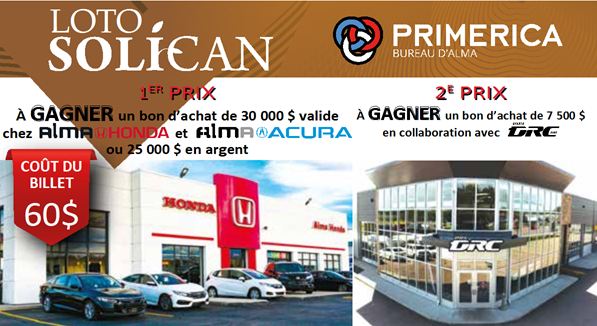 2ebillet tiré : bon d’achat de 30 000$ valide chez Alma Honda ou Alma Acura, ou un montant en argent de 25 000$.